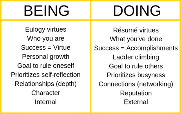 Résumé virtues are much easier to teach and measure, and most students and young professionals focus on developing them first. As Brooks says, “Many of us are clearer on how to build an external career than on how to build inner character.”